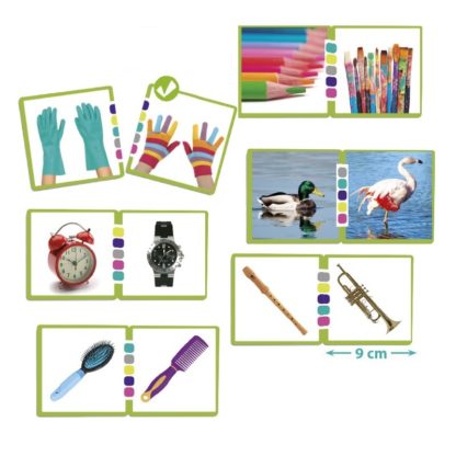 Hra sa skladá z 34 kartičiek (9×9 cm), ktoré tvoria 17 párov. Didaktický materiál je založený na logickom priraďovaní a vytváraní súvisiacich dvojíc. Predmety na kartách sú ľahko rozoznateľné a pomenovateľné. Pomôcka je výborným zdrojom pre rozvoj reči. Obsahuje samokontrolný opravný systém a pedagogický návod.