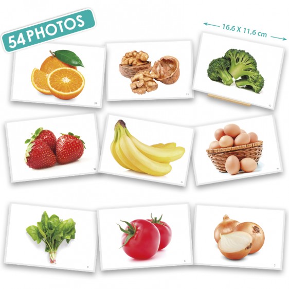 54 fotografií s rozmermi 16,6×11,6 cm, ktoré znázorňujú potraviny vždy v dvoch rozdielnych stavoch. Deti získajú komplexnejšie vedomosti o potravinách a obohatia si reč o slovné spojenia ako napr.: celé, rozrezané, jeden kus, veľa, otvorené, atď. Obsahuje pedagogický návod a podstavec na prichytenie fotografií.