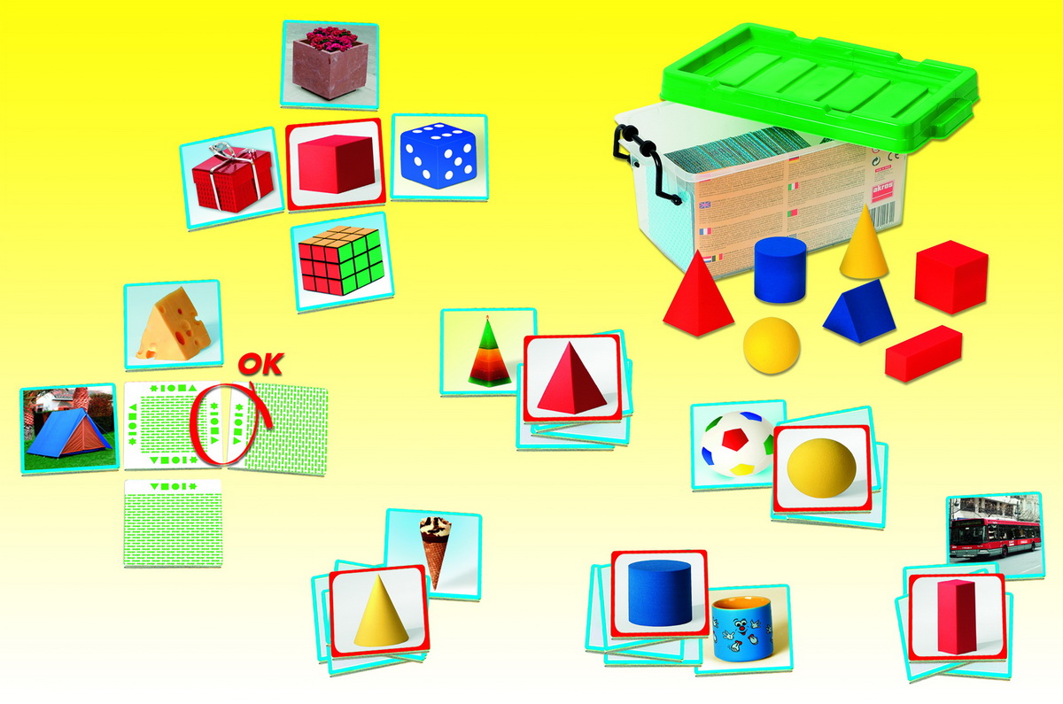 Pomôcka pozostáva zo 7 plných geometrických telies a 35 kartičiek s fotografiami. Kartičky možno rozdeliť na 7 základných, ktoré zobrazujú samotné geometrické telesá a 28 fotografií objektov, ktoré reprezentujú geometrické tvary v bežnom živote. Obsahuje samokontrolný opravný systém a pedagogický návod.