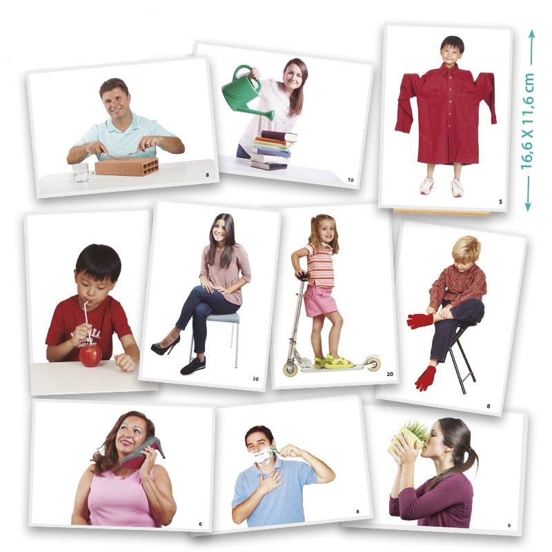 50 fotografií s rozmerom 16,6×11,6 cm, ktoré reprezentujú bežné situácie, na ktorých však nie je všetko v poriadku – niektorý nástroj alebo časť oblečenia je nesprávne použitý. Obrázky pomáhajú rozvíjať pozorovacie schopnosti.