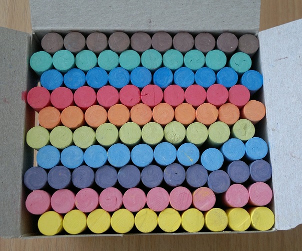 Balenie 100 ks okrúhlych kried v 10 farbách. Vhodné na písanie na školskú tabuľu i na kreslenie na chodník.