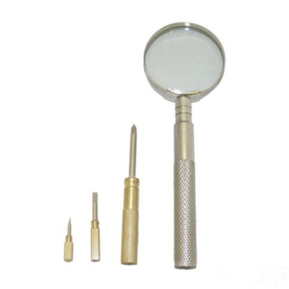 Lupa s kovovou rúčkou. Zväčšenie 2,5x, priemer lupy 70mm. V rúčke je integrovaná sada 3 skrutkovačov.
