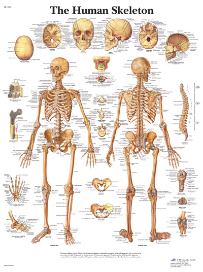 Obraz znázorňuje anatomické detaily všetkých častí ľudskej kostry. Veľkosť 50×67 cm, laminovaný, UV odolný papier popisovateľný fixkami, kovové očká na zavesenie. Popis v AJ.