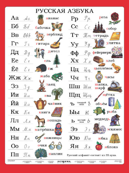 Náučná tabuľa RUSKÁ ABECEDA je našim prvým príspevkom pre výuku ruského jazyka. Tvorí pútavý úvod do sveta ruských písmen a slov. Humorne ilustrované písmená ruskej abecedy majú u žiakov hravou formou prebudiť záujem o cudzí jazyk a napomôcť zvládnuť čítať a písať v azbuke. Zadná strana tabule umožňuje nácvik písania písmen, ich správny tvar a sklon.