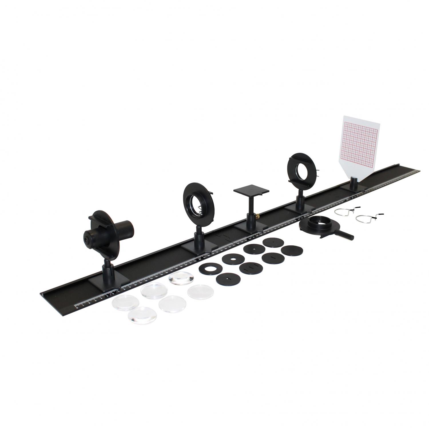 Obsah 1 sady: 1 optická lavica z plastu, 3dielna, 1 LED zdroj svetla (3W) so sieťovým adaptérom, 5 plastových jazdcov, 4 držiaky šošoviek pre 40mm šošovky a diarámčeky a upínací krúžok, 1 držiak na optický hranol, 1 premietacie tienidlo s mriežkou x 150 mm), 6 plastových šošoviek d=40 mm (f=-200/-100/+50/+100/+150/+250 mm), 8 plastových prvkov d=40 mm (5 clôn s otvormi, 3 štrbiny ), 1 úložný kufrík s vložkou z peny.