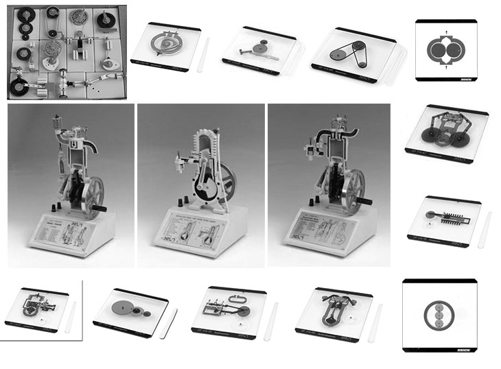 Zostava na demonštráciu základných mechanizmov, pohonov a prevodov. Súprava obsahuje 10 funkčných modelov mechanizmov a prevodov, ktoré možno prepájať, 3 rôzne 3D modely motorov v reze a 11 rôznych 2D modelov pohonov a prevodov v reze.