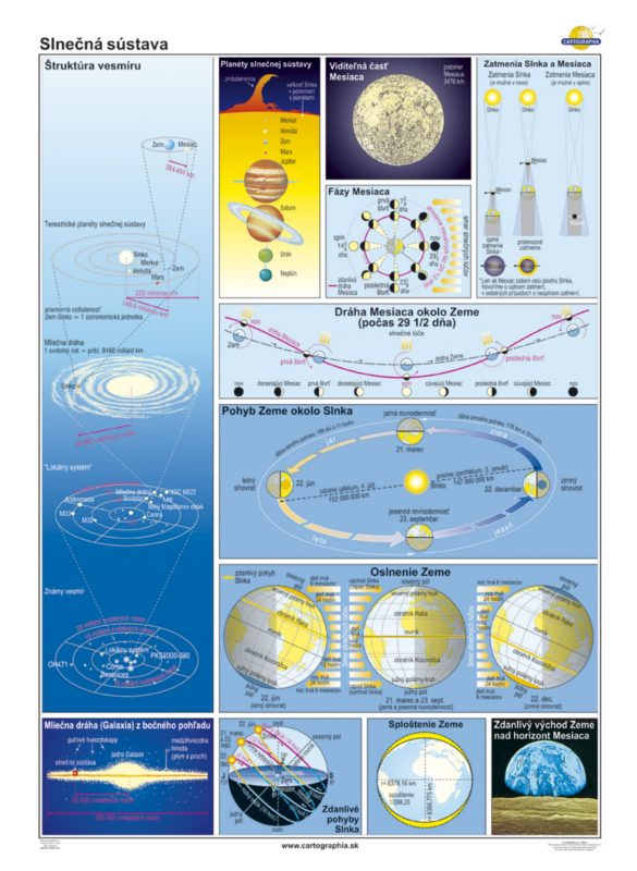 Štruktúra vesmíru, Mliečna dráha z bočného pohľadu, planéty slnečnej sústavy, viditeľná časť Mesiaca, fázy Mesiaca, dráha Mesiaca okolo Zeme, pohyb Zeme okolo Slnka, zatmenie Slnka a Mesiaca, oslnenie Zeme, zdanlivý pohyb Slnka, sploštenie Zeme, zdanlivý východ Zeme nad horizont Mesiaca. Nástenná mapa, 120X160 cm.