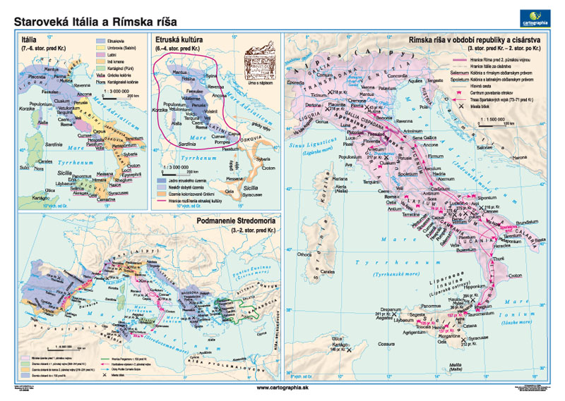 Nami ponúkané dejepisné nástenné mapy zobrazujú veľmi prehľadne a chronologicky historické udalosti a dejové prepojenia v rôznych časových obdobiach. Obsahuje mapu Itálie, Etruskej kultúry, Podmanenie Stredomoria, Rímsku ríšu v období republiky a cisárstva. Sú vynikajúcou učebnou pomôckou, ktorá uľahčuje výklad učiva a prispieva k jeho ľahšiemu chápaniu a osvojovaniu.